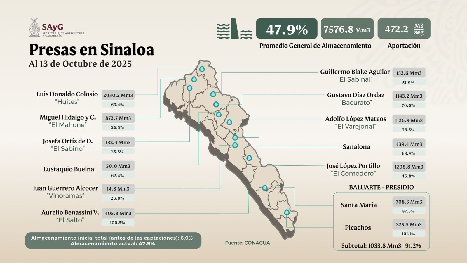 Ismael Bello Esquivel, Secretario de Agricultura y Ganadería, indicó que actualmente, se cuenta con un almacenamiento de 6,269.16 mm2, que representa un 47.9 por ciento en lo general, en donde la presa “El Salto” cuenta al 100.5% de su almacenamiento total.