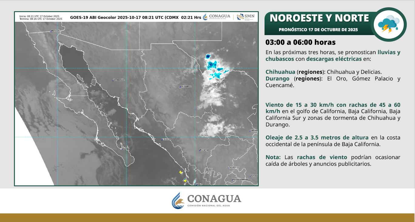 El organismo dependiente de la Comisión Nacional del Agua (CONAGUA) señala en su reporte diario que en la región noroeste, se registra desde las primeras horas cielo medio nublado a nublado con chubascos en Sinaloa (sur) y cielo parcialmente nublado y sin lluvia en Sonora.