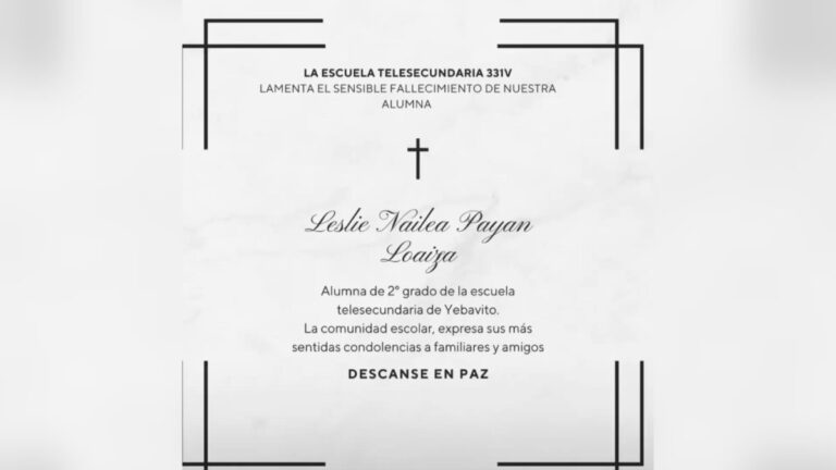 “La escuela Telesecundaria 331V lamenta el sensible fallecimiento de nuestra alumna Leslie Nailea Payán Loaiza, alumna de segundo grado de la telesecundaria de Yebavito. La comunidad escolar, expresa sus más sentidas condolencias a familiares y amigos. Descanse en paz”, expresó el mensaje de la escuela donde estudiaba la menor.