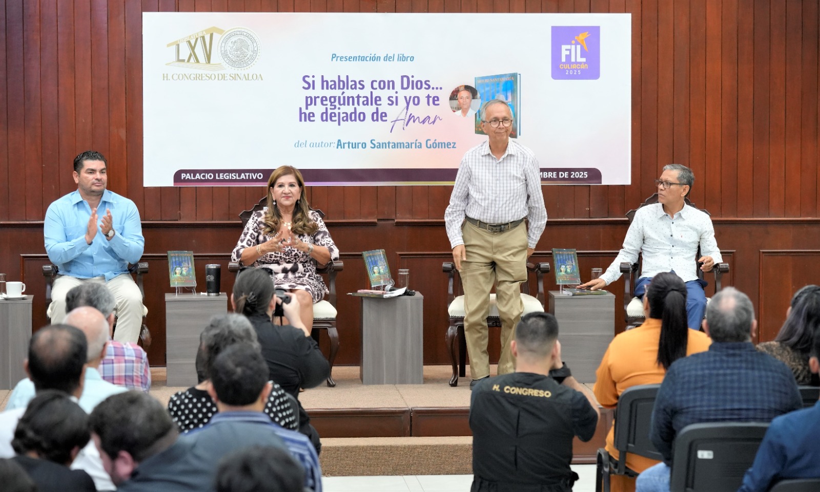 Durante la presentación, que tuvo lugar en el Salón Constituyentes de 1917 del Congreso del Estado de Sinaloa, se contó con la presencia del autor, Arturo Santamaría Gómez, de quien la diputada aseguró que aun cuando nació en la Ciudad de México en realidad hizo del puerto de Mazatlán su casa, y de Sinaloa su patria.