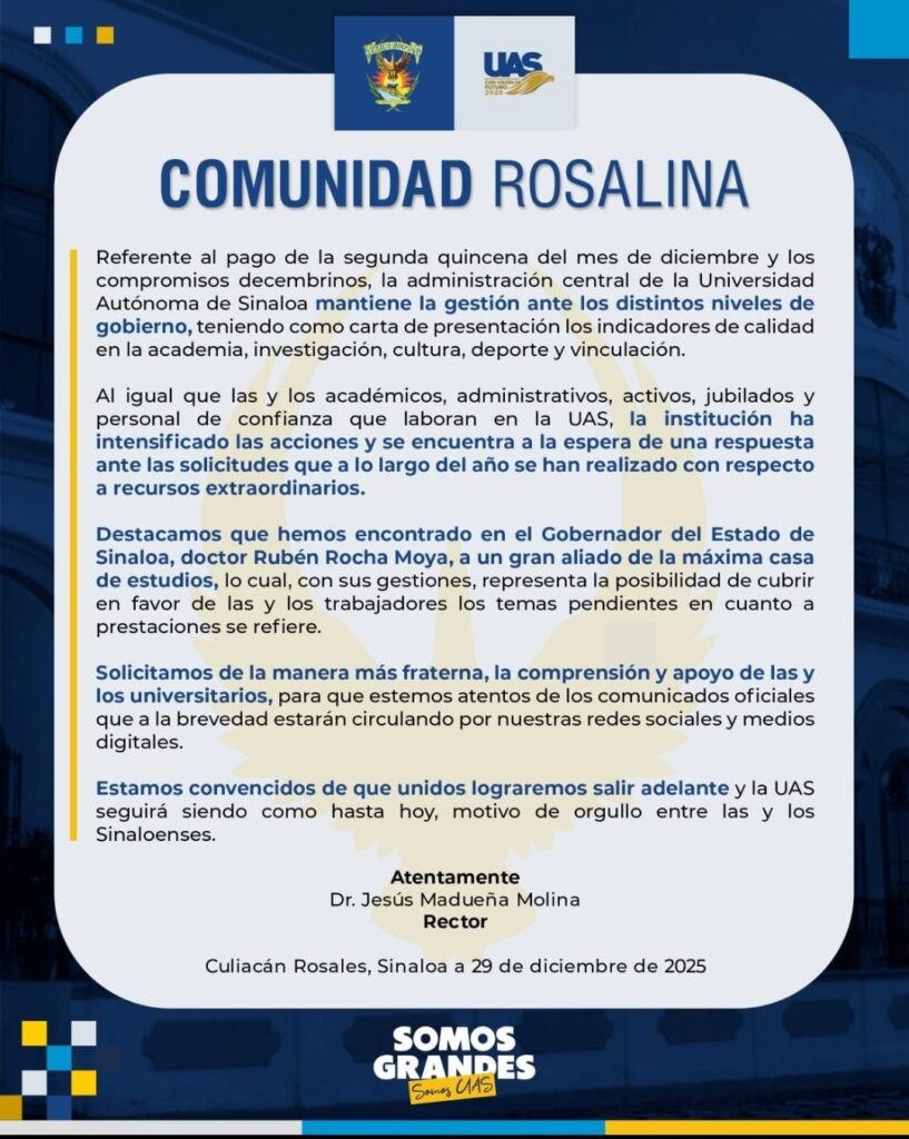 “Referente al pago de la segunda quincena del mes de diciembre y los compromisos decembrinos, la administración central de la Universidad Autónoma de Sinaloa mantiene la gestión ante los distintos niveles de gobierno, teniendo como carta de presentación los indicadores de calidad en la academia, investigación, cultura, deporte y vinculación”, se puede leer en el comunicado.