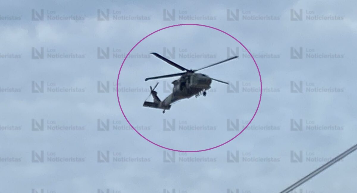 Un helicóptero de la Secretaría de la Marina sobrevuela a muy baja altura sobre la colonia en mención, a una calle del Boulevard Ciudades Hermanas, entre Río Piaxtla y Río Quelite.