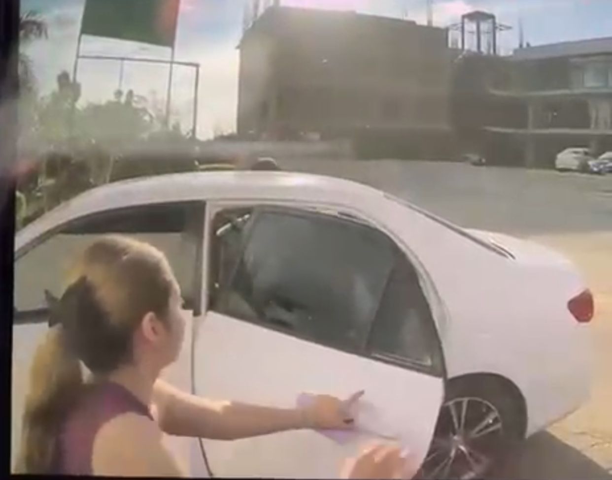 En el video aparentemente tomado por su vehículo se puede apreciar como la joven baja de la parte del conductor, cuando un automóvil color blanco le cerró el paso, mientras ella intentaba cerrarles y volver a subirse a su Cybertruck para huir de ellos.