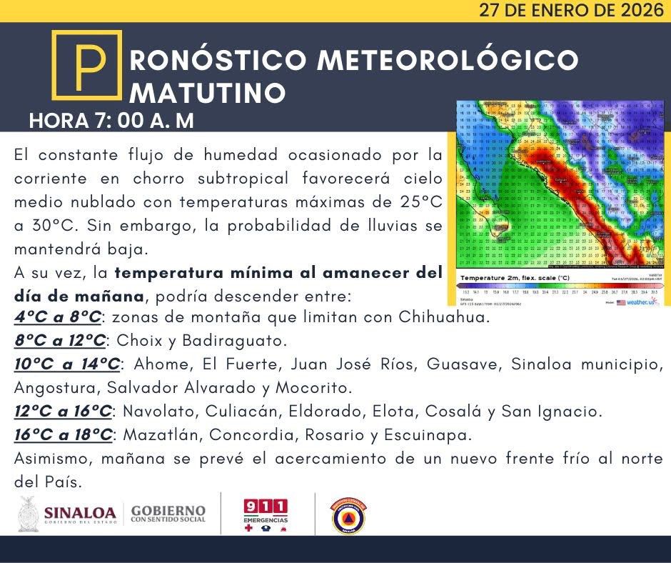 Culiacán, Sinaloa.- Para el día miércoles 27 de enero de 2026 se prevé un amanecer con bajas temperaturas en gran parte de Sinaloa, informó el Sistema Estatal de Protección Civil.