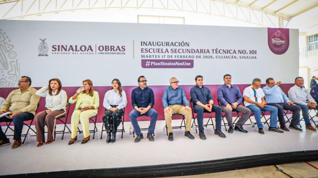 Culiacán, Sin.- El gobernador del estado de Sinaloa, Rubén Rocha Moya, acompañado del alcalde de Culiacán, Juan de Dios Gámez Mendívil, y la secretaria de Educación Pública, Gloria Himelda Félix Niebla, inauguró este martes 17 de febrero la Secundaria Técnica número 101, ubicada en Valle Alto, al norponiente de la capital sinaloense.
