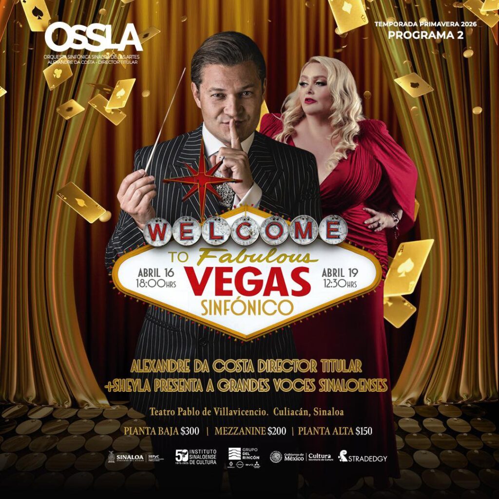 Culiacán, Sinaloa.- La Orquesta Sinfónica Sinaloa de las Artes (OSSLA), anunció la realización del concierto Las Vegas Sinfónico con Alexandre De Costa y Sheyla, en el cual se tendrá la oportunidad de escuchar canciones de grandes que triunfaron en el escenario de esta ciudad estadounidense.